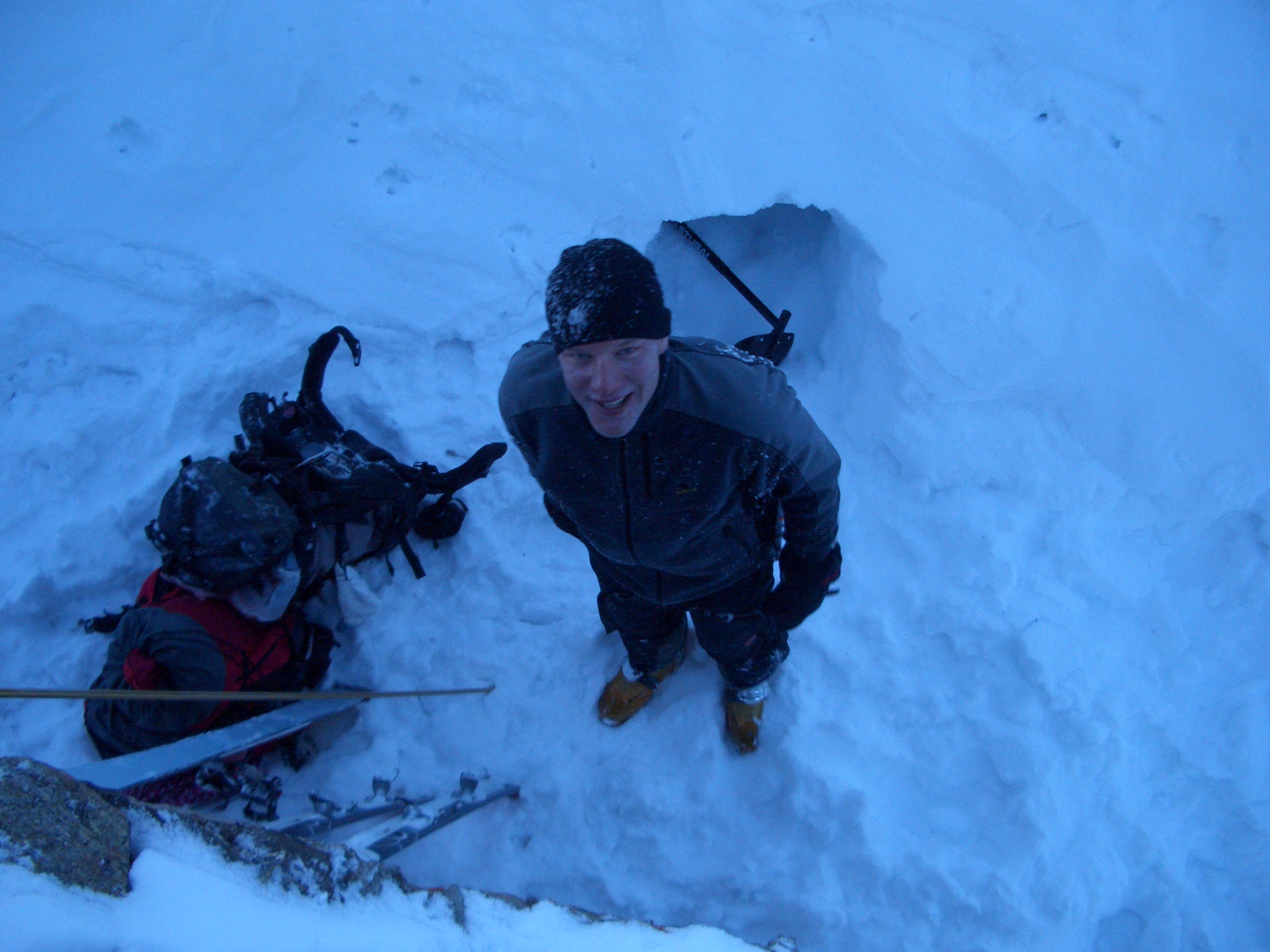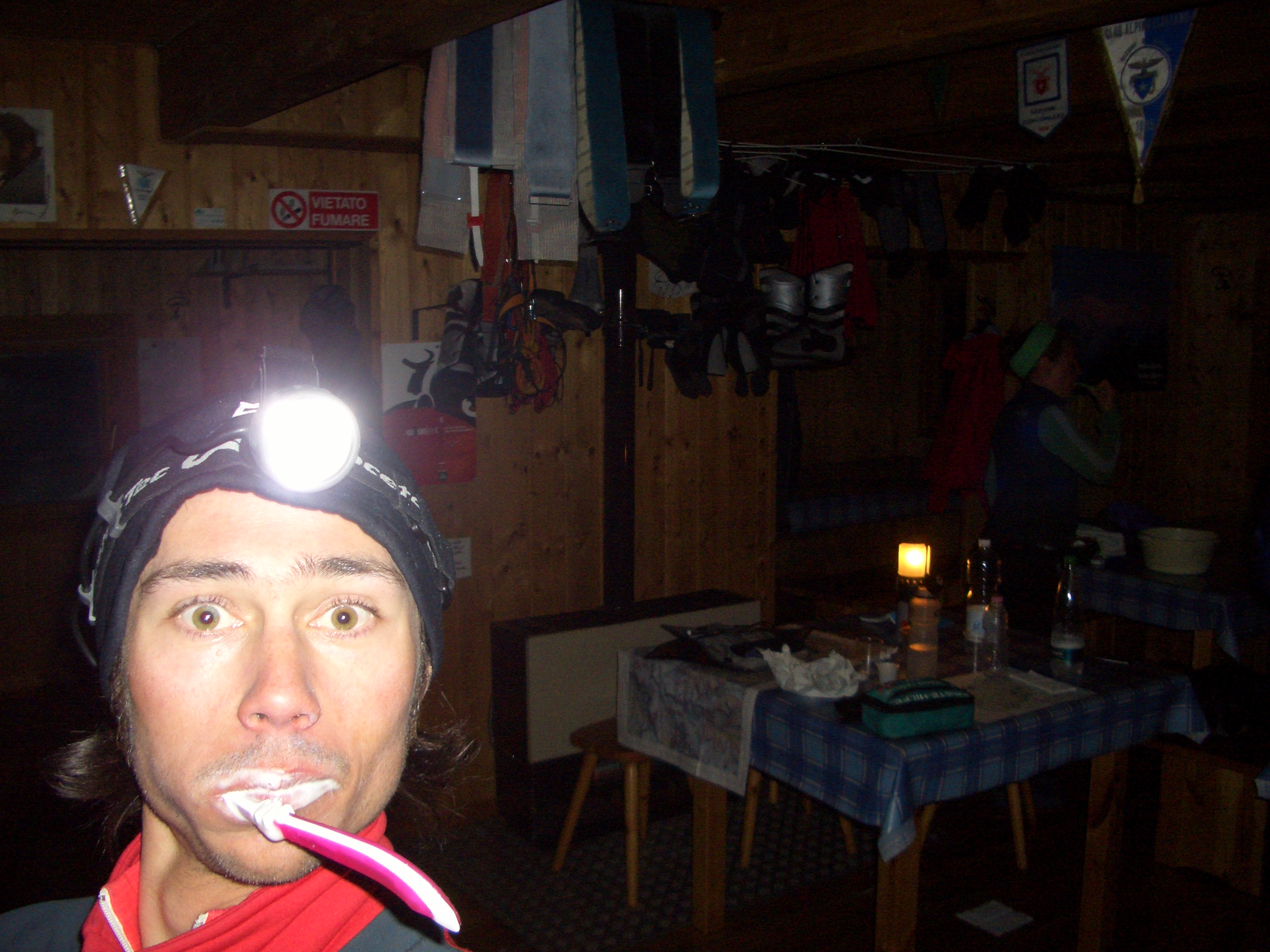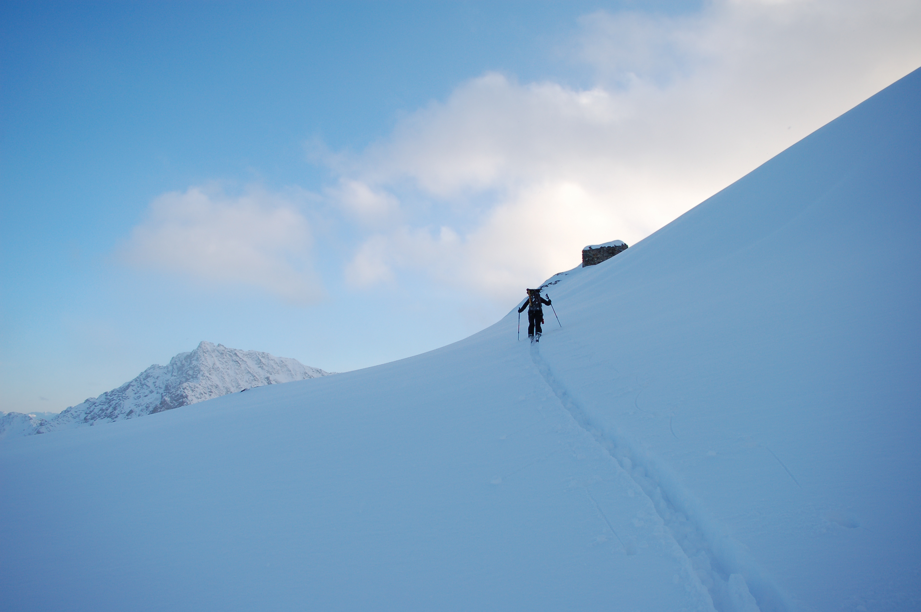ein tag würde uns wohl noch länger in erinnerung bleiben. nach vielen stunden spurarbeit zum refugio aosta war klar, das wird sich nicht mehr ausgehen. in unseren karten sahen wir eine biwakschachtel eingezeichnet, welche uns als alternative dienen sollte. bei einem bach konnten wir vor einbruch der dunkelheit noch unsere flaschen auffüllen, kurz bevor wir feststellen mussten, dass diese notunterkunft mit eingestürztem dach, in trümmern vor uns lag. shit happens! der gedanke nach einem sehr langen tourentag, hungrig und durchgeschwitzt bis aufs letzte in einem schneeloch „schlafen“ zu müssen, war, bescheiden gesagt suboptimal. während wir schon fast fertiggeschaufelt hatten, ergab eine zwischenzeitliche erkundungstour doch noch eine alternative – bivak perucca – (natürlich nicht in der karte eingezeichnet) und es gab sogar eine gasflasche… die nacht war gerettet! in gefrorenen decken gewickelt, konnte ich kein auge zumachen, die kälte war einfach furchtbar, hatte ich doch als einziger, zwecks gewichtsoptimierung keine dicke daunenjacke dabei. am nächsten tag stand eine abfahrt zu einem italienischen bergsteigerdorf am plan – zum glück ergatterten wir einen riesigen topf nudeln, sodass wir gestärkt und mit neuem willen zum nächsten tagesziel aufsteigen konnten….