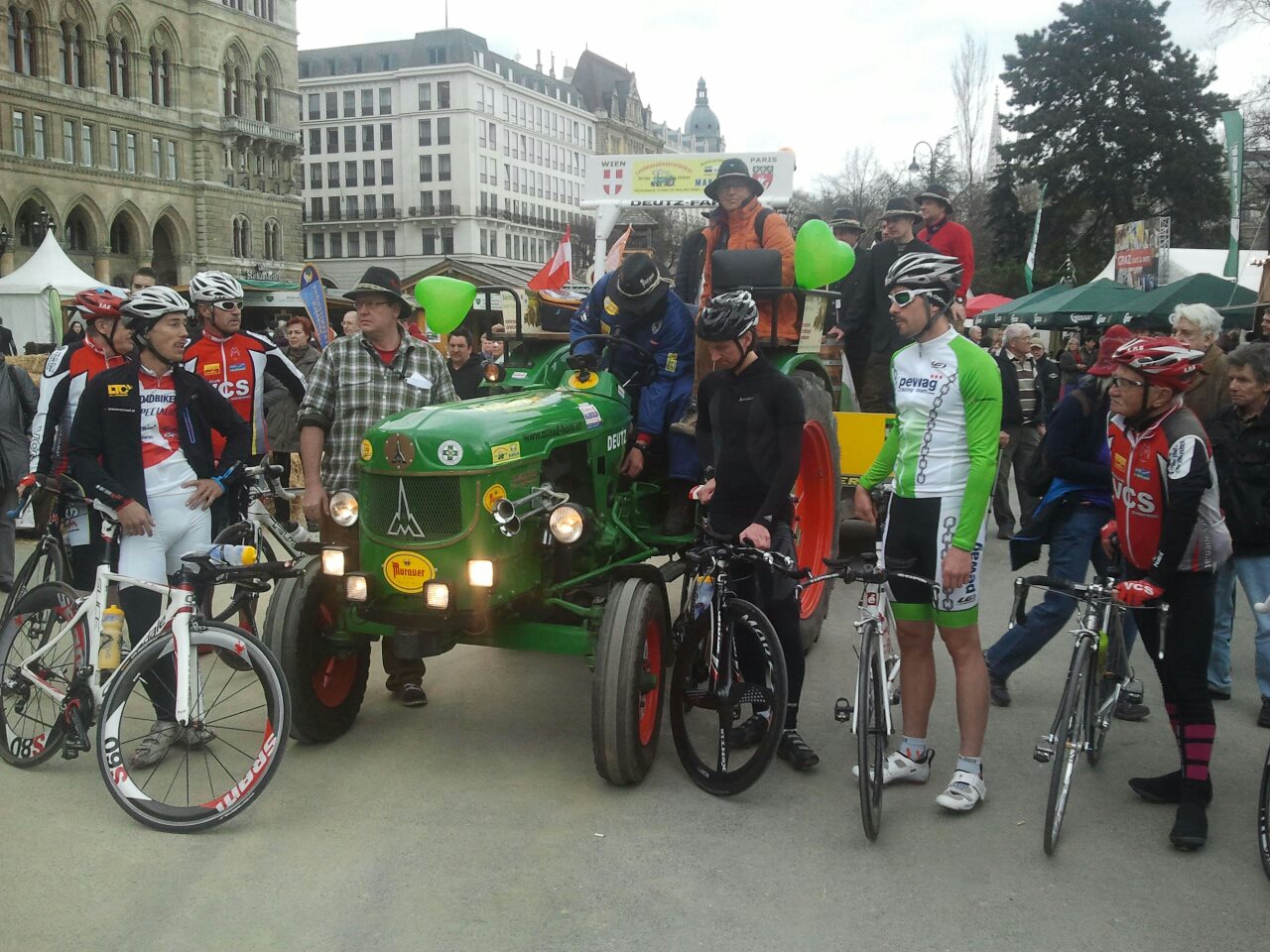 den offiziellen start verlegten wir zur stadtgrenze richtung purkersdorf – in der stadt wäre es viel zu gefährlich gewesen. schon beim anstieg auf die baumgartner höhe (~1km) merkten wir, sch… der traktor fährt zwar „nur“ 30km/h ABER auch bergauf mit unveränderter geschwindigkeit! wir drei hatten bei diesem anstieg jeweils >500watt am tacho – sch…. so klar ist die sache ja gar nicht! … leider haben wir bei diesem anstieg (bis auf einen) die radkollegen vom VCS velo-club simmering verloren, welche uns bis dahin gesellschaft leisteten… danke fürs mitrollen!
